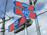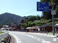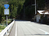 田辺市龍神村(旧:日高郡龍神村)小家地区からはR424と重複する。小家地区からR371重複区間の龍神村湯ノ又地区までの間は、和歌山県の内陸部骨格道路(X軸ネットワーク)として整備・改良が進められている区間で、小家からのR424・R42 5は整備された2車線道が続く。 日高川に沿って山間を進んで行き、3kmほど進むと龍神村甲斐ノ川の集落に至る。集落内を経由する旧道が分岐すると、バイパス道路の一部となる甲斐ノ川トンネル(L=603m)を通り抜け、トンネルを出ると龍神村福井に入る。再び日高川沿いを700mほど進むと道の駅『水の郷日高川龍游』を過ぎ てR425福井バイパス区間に入る。R425福井バイパスも内陸部骨格道路の一部として整備された道路。R424重複区間も一部が含まれている。 道の駅前から整備された2車線道で500mほど進むとR425福井バイパスの大正橋西詰に到着。ここでR424から単独分岐して龍神村西地区に向かう。 |