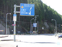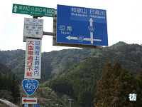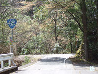 R425は田辺市龍神村(旧:日高郡龍神村)湯ノ又にあるR371龍王橋南詰で単独分岐する。龍神村西地区方面から来た場合は、交差点を右折して小又川トンネル(L=110m)に入ることになる。小又川トンネルは平成12年(2000年)11月に開通したバイパストンネルで、それまではR371旧道を一部含めた狭路となっていた。 トンネル西側抗口前には『幅員狭小』と迂回路が記された標識が設置されており、この先が悪路であることを予告している。 |