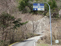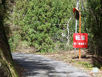 平成12年(2000年)5月走行時に撮影したのが左の写真。転落注意の標識だが、ご覧の通り”死亡”が逆転している。転落して転覆したことを現しているのだろう。他にも『転落死亡事故』という標識はあったが、このタイプは区間内に唯一枚だけであった。うまいこと表現している標識だとつくづく思う。 平成22年(2010年)4月走行時、この標識を探したのだが見つからなかった。見落としたのか?目立つから見落とすことはまずないと思うのだが・・・。あまりにもリアルすぎて苦情が来て撤去されたのかもしれない。 |