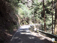 林道猪笹線分岐点を道なりに右に向かうと、イダサ谷を猪笹橋で渡る。そこから先はやや急勾配の狭路坂道となり、県境目指して標高を上げて行く。ガードレールのない狭路が続くが、1〜1.5車線道が断続するようになり、気分的に少しは楽になる。 しかし路面状態は相変わらず良くなく、大雨で出来た路上河川が残っている場所があった。 淡々と深い山中を進んで行き、林道猪笹線分岐点から約2.7kmで和歌山県と奈良県の県境に到着する。龍神村湯ノ又のR371交差点から約17kmである。 |